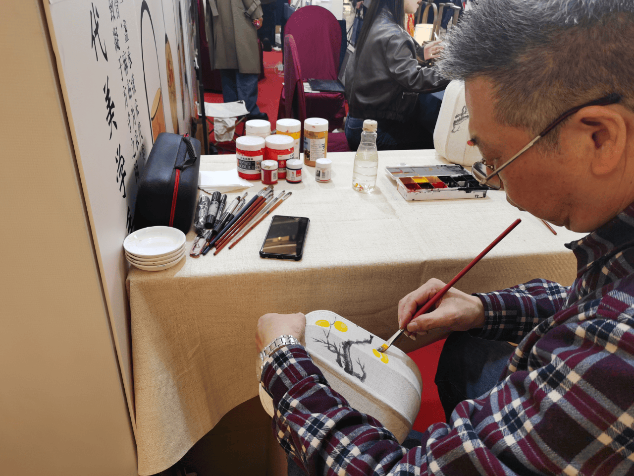 当日,在中山市沐阳文化传媒有限公司的展位前,正在作画的师傅对《消费者报道》记者称,其设计理念为“以灯为主、以画为辅,通过创新和古为今用,将灯具的实用性与艺术性融合起来”。
